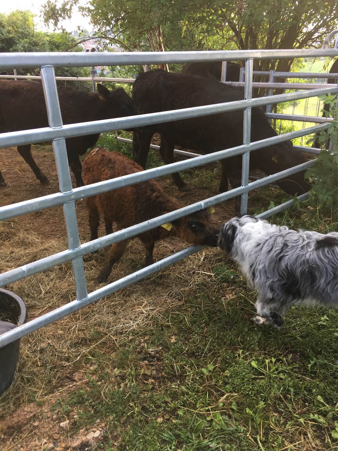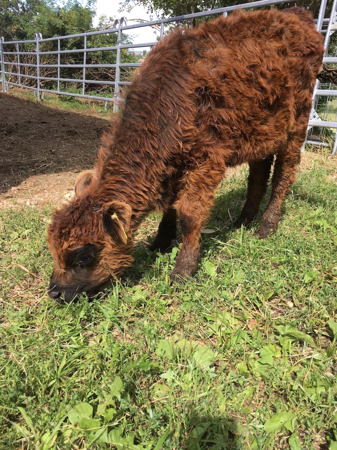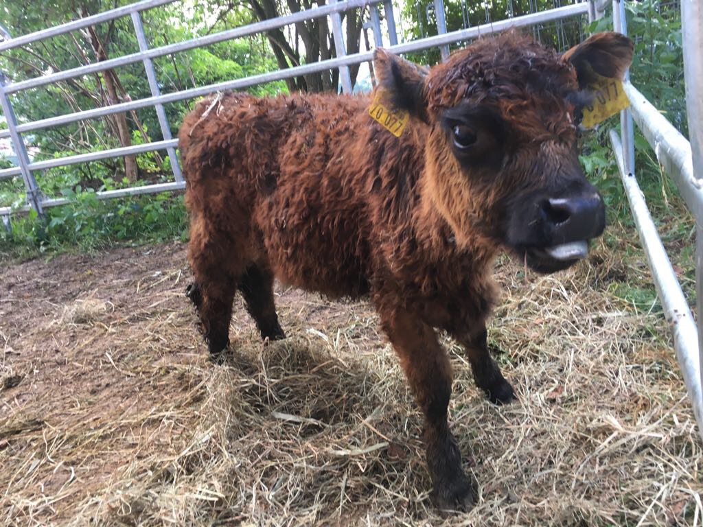 Im Jahr 2017 fiel uns beim Abholen von Galloways ein ganz besonderes Kälbchen auf. Die Mutter hatte leider keine Milch für das kleine Kälbchen. Da es zweimal täglich eine Flasche braucht, entschlossen wir uns, das Kälbchen mitzunehmen und aufzuziehen. So kam die kleine Emmy zu uns – unser Flaschenkälbchen.