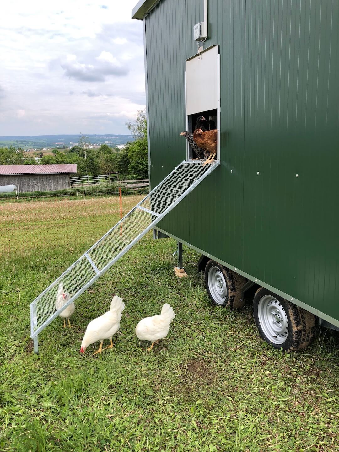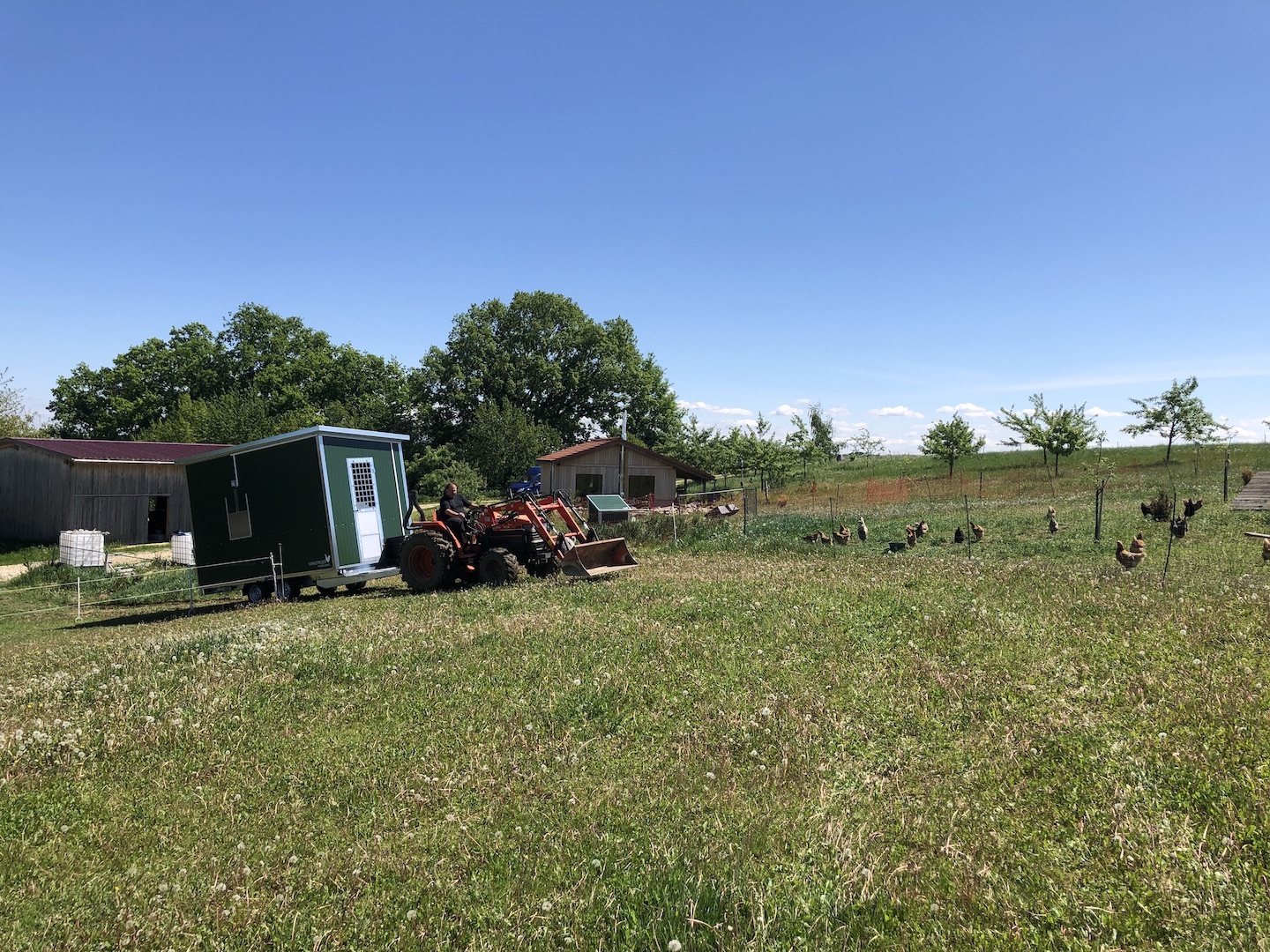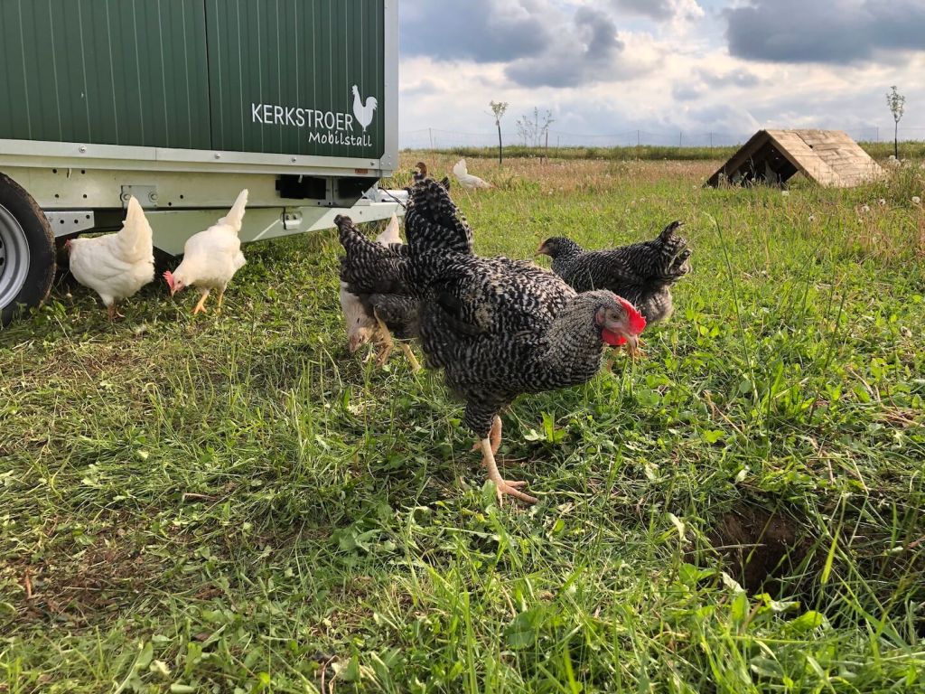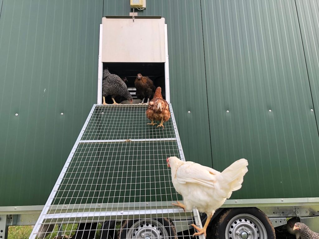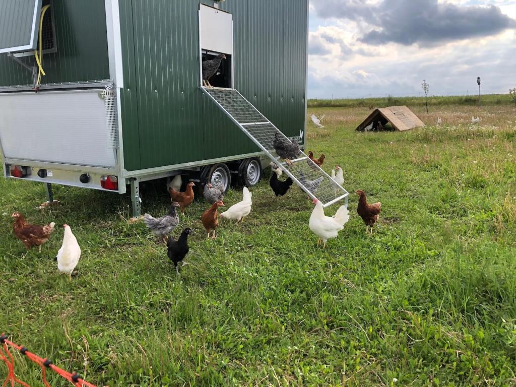 Um diese Verringerung der Legeleistung abzufangen und die größere Nachfrage bedienen zu können, haben wir am 06. Mai 2020 ein Hühnermobil für 120 Hühner bekommen.