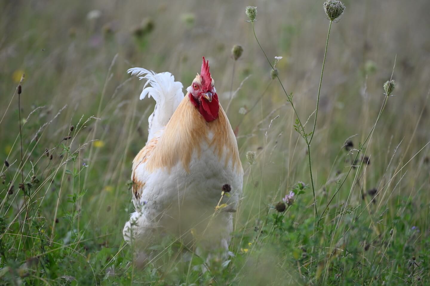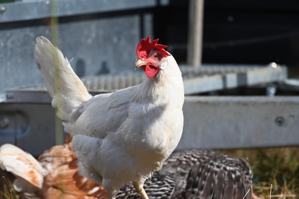 Wir weißen Hühner sind sehr flink und neugierig